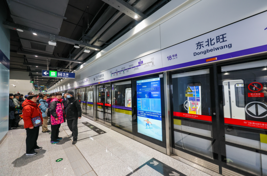 记者注意到,18号线各站的站台门旁安装了与站台门一样高的综合信息屏,上方可以实时显示列车到站时刻和拥挤度信息,中间部位还能显示车站的列车时刻表。北京地铁运营三分公司18号线站区负责人王力奎告诉记者,这块信息屏替代了原本挂在站台上的电视,可以避免电视对站内导向标志的遮挡,显示的信息内容更加清晰明了。